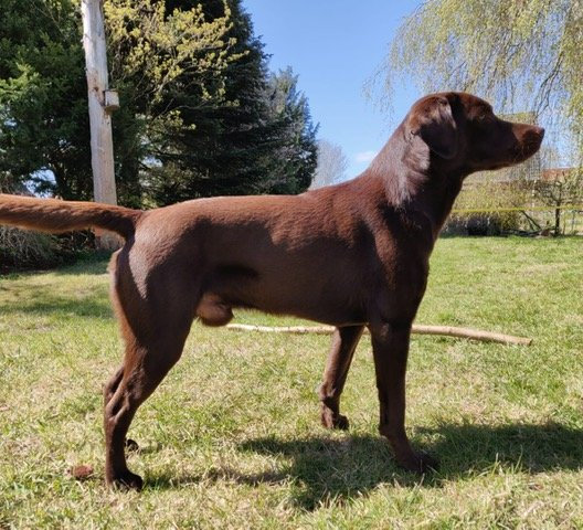 Freundlicher, etwas leichterer Rüde, korrektes, braunes Haarkleid, recht gute Knochenstärke, gut geschnittener Kopf, der etwas maskuliner sein könnte, korrekte Oberlinie, Otterrute, Brustkorb noch etwas schmal, noch etwas eng in der Bewegung.